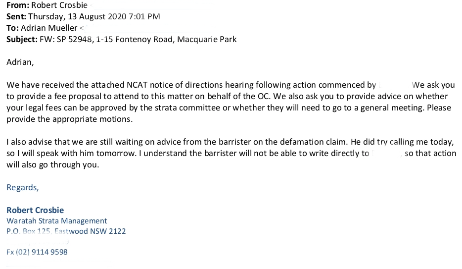 6. Are you aware that your work for alleged defamation case against us was never approved by owners corporation at any legally compliant general meeting?