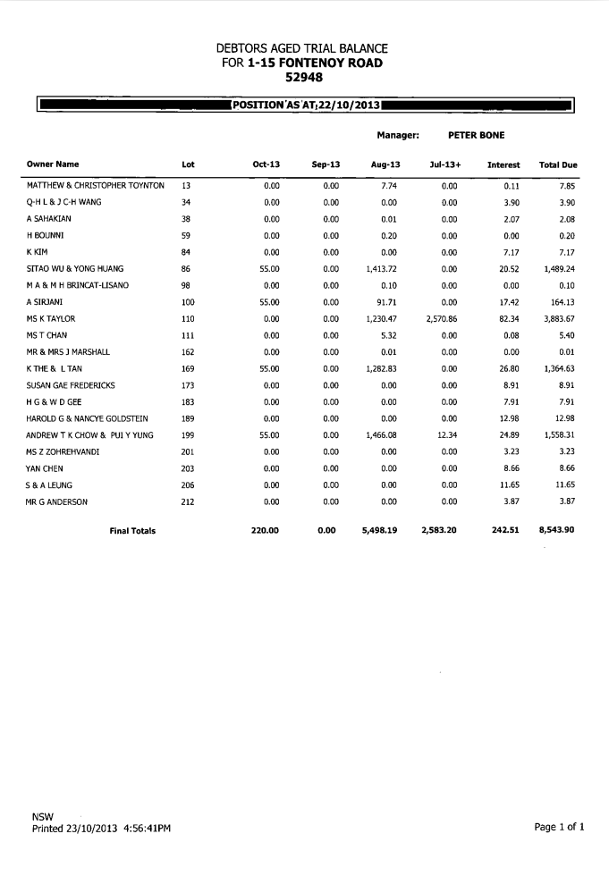 40. On 3 August 2025, strata manager Mr. Alex Tomasko, and committee members Mrs. Genelle Godbee, Mr. Stan Pogorelsky, Mr. Ramesh Kamini, Mr. Joe Spatola, Mr, Carlos Fornieles Montoya, and Mr. Jeffery Wang were warned about Mr. Jeffery Wang and Mr. Stan Pogorelsky failing to pay proper levies at AGM 2013. They stayed silent and did not share this information with owners.