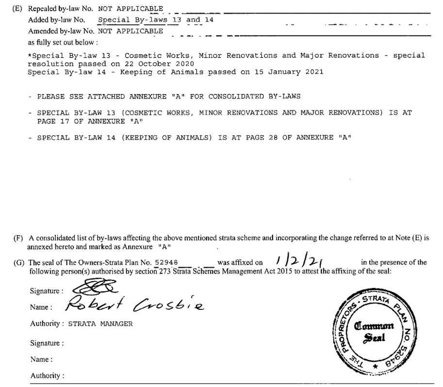Lot 88 (committee member Mrs. Marianna Paltikian) submitted her request for keeping a small dog one month before the Special By-Laws was registered by Waratah Strata Management on 1 February 2021, without disclosur to owners that she already had a dog. Document search on 8 June 2022 found no evidence that Mrs. Marianna Paltikian paid prescribed levy for keeping a dog, that applies to all owners: