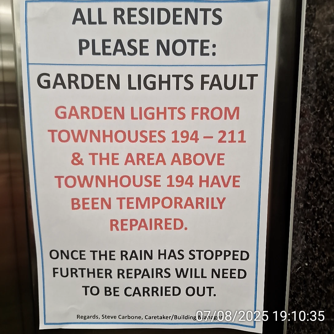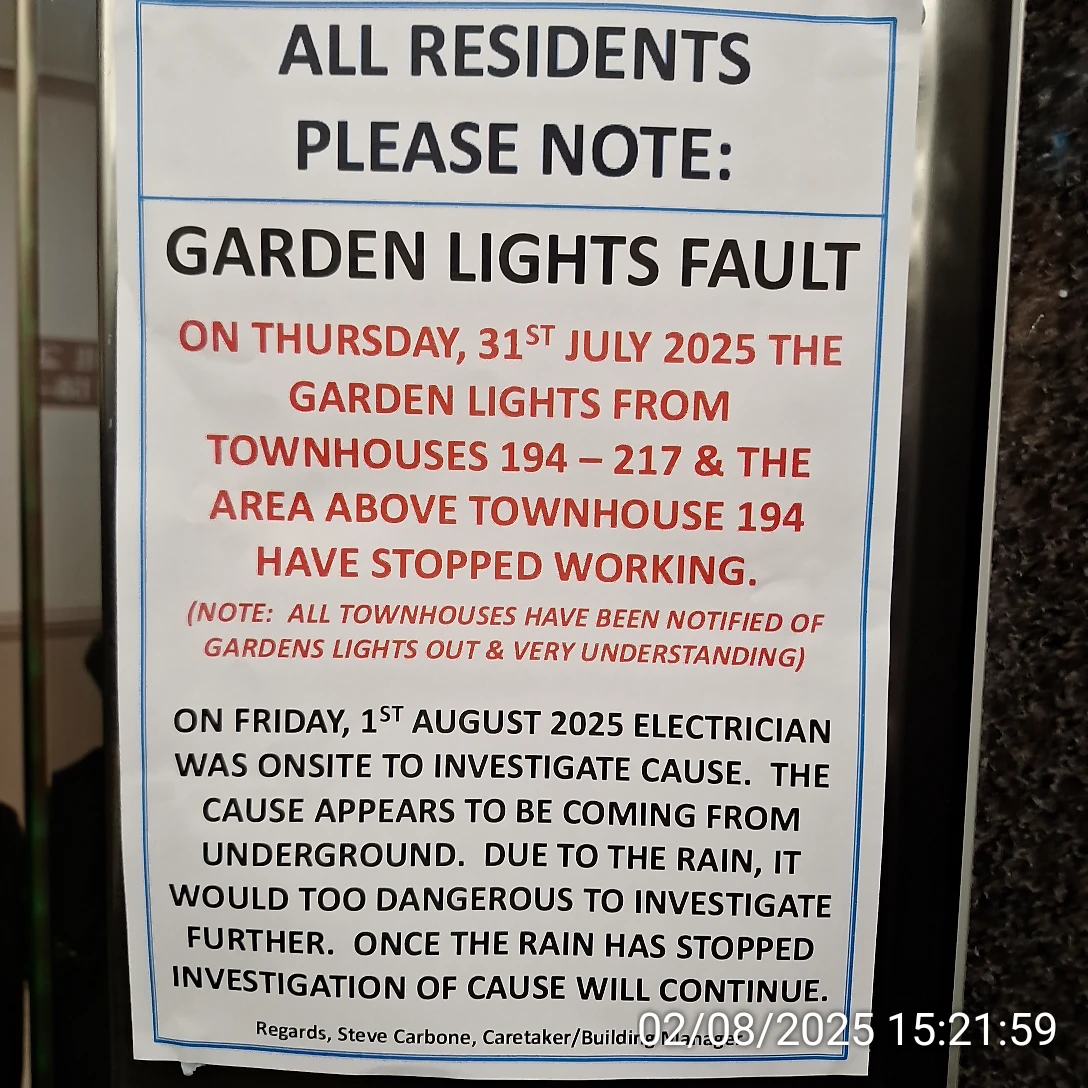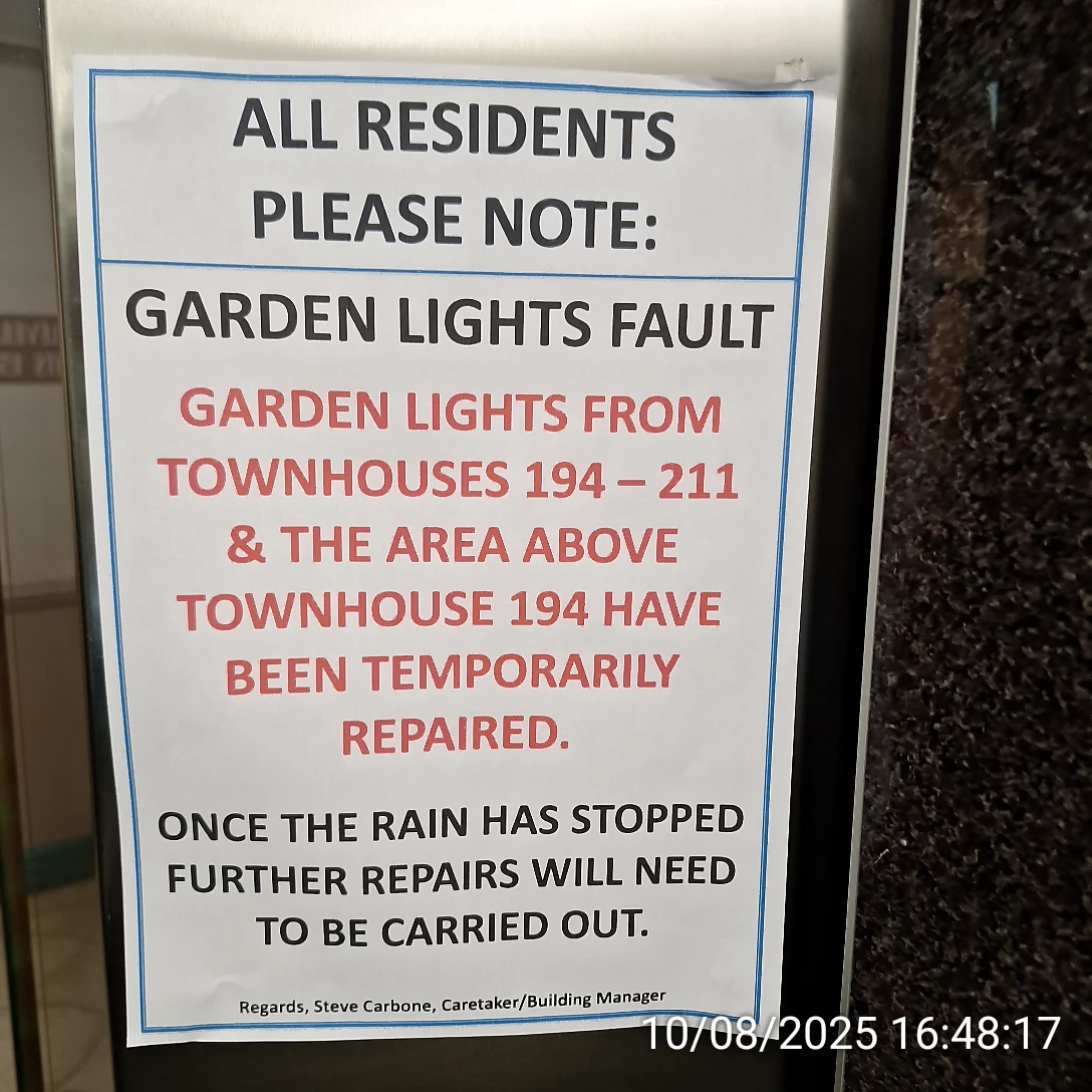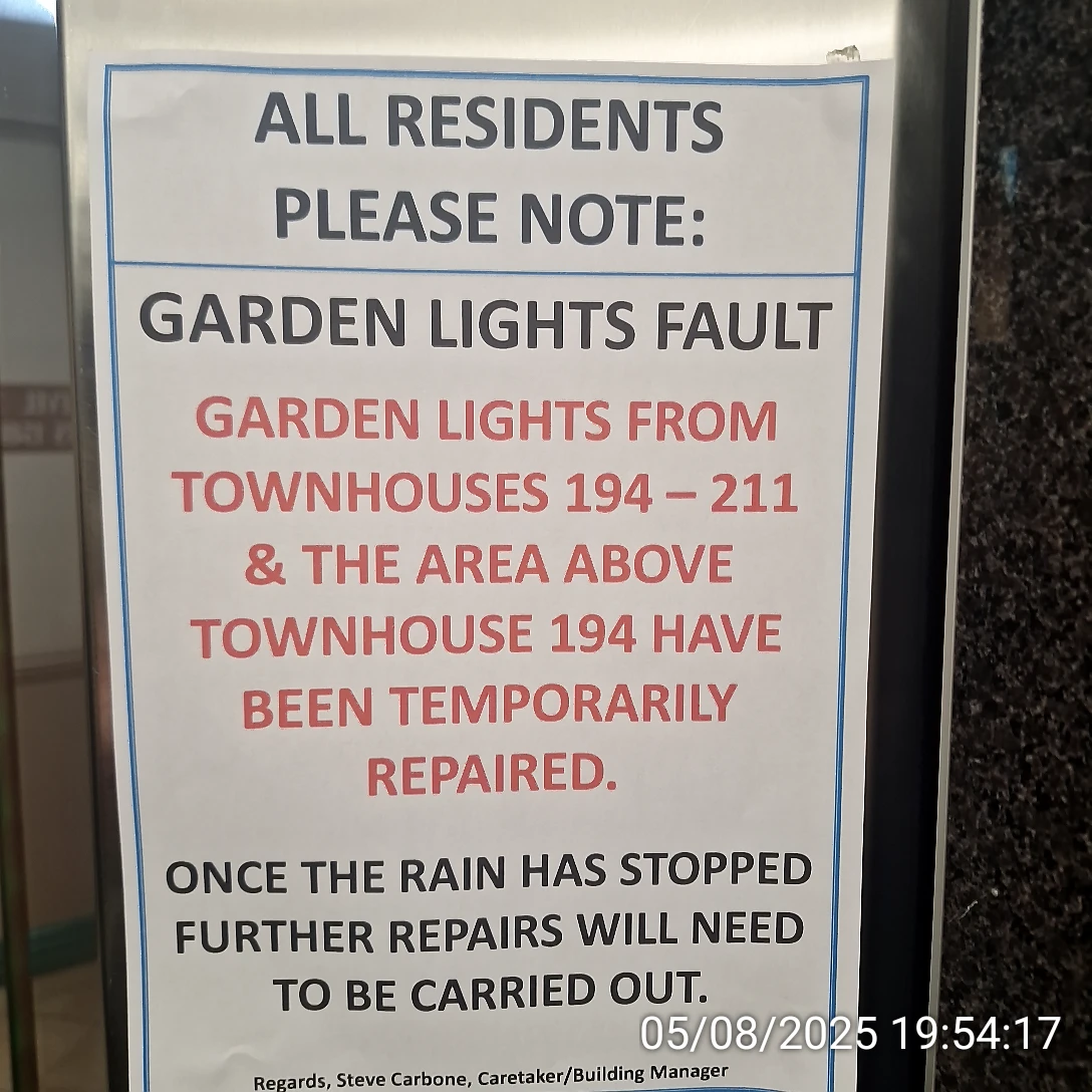 On 20 August 2025 two garden lights between townhouse 194 and Block A were faulty, without any notices for owners. One of them was allegedly repaired for a few days and then it failed again: